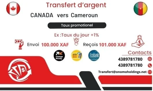 Chez ONOMO HOLDINGS INC., nous facilitons l’envoi d’argent depuis le Canada vers le Cameroun et le Gabon, en offrant un service à la fois rapide, sécurisé et transparent. Notre entreprise est née de l’envie d’aider les Canadiens à soutenir leurs proches en Afrique centrale, sans complications ni délais inutiles. Chaque transfert est traité avec rigueur et fiabilité, et nous nous engageons à garantir des taux justes et clairs, pour que nos clients puissent envoyer de l’argent en toute confiance. Animés par les valeurs de proximité, d’innovation et de transparence, nous mettons la technologie moderne au service de l’humain, afin que chaque transaction se déroule de manière simple et efficace. Notre équipe combine expertise financière, connaissance des réglementations et attention personnelle à chaque client, car nous savons que derrière chaque transfert se trouvent des familles et des projets importants. Que vous souhaitiez soutenir votre famille, vos amis ou vos proches, ONOMO HOLDINGS INC. s’engage à rendre vos transferts d’argent vers le Cameroun et le Gabon sûrs, rapides et accessibles à tous.